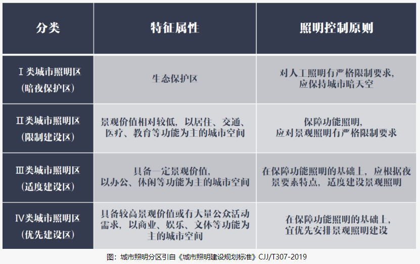 《標準》要求進行“四區(qū)劃定”(即劃定暗夜保護區(qū)、限制建設(shè)區(qū)、適度建設(shè)區(qū)及優(yōu)先建設(shè)區(qū)),以落實城市夜間的生態(tài)保護,并有效控制城市照明的建設(shè)規(guī)模和建設(shè)強度,避免過度建設(shè)引發(fā)城市生態(tài)事故,干擾公眾夜間正常生活,增加城市能源消耗,加重政府財政負擔。